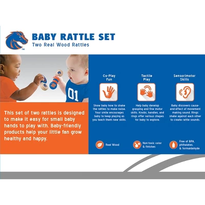 This set of two rattles of Boise State is designed to make it easy for small baby hands to play with. Baby-friendly products help your little Blues fan grow healthy and happy. Growth & Development toys offer Co-Play Fun, Tactile Play, and Sensorimotor Skills. Show baby how to shake the rattles to make noise. Your smile encourages baby to keep playing as you teach them new skills. Help baby develop grasping and fine motor skills. Knobs, handles, and rings offer various shapes for baby to explore. Baby discovers cause-and-effect of movement making sound. Rings shake against each other to create rattle sounds. Real wood rattles are 100% Baby Safe made with real wood, non-toxic colors & finishes, and free of BPA, phthalates, & formaldehyde.
