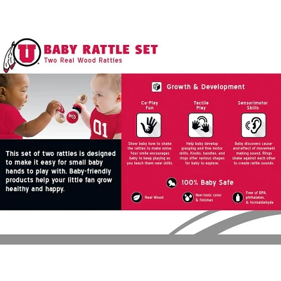 This set of two rattles of Utah is designed to make it easy for small baby hands to play with. Baby-friendly products help your little Utah fan grow healthy and happy. Growth & Development toys offer Co-Play Fun, Tactile Play, and Sensorimotor Skills. Show baby how to shake the rattles to make noise. Your smile encourages baby to keep playing as you teach them new skills. Help baby develop grasping and fine motor skills. Knobs, handles, and rings offer various shapes for baby to explore. Baby discovers cause-and-effect of movement making sound. Rings shake against each other to create rattle sounds. Real wood rattles are 100% Baby Safe made with real wood, non-toxic colors & finishes, and free of BPA, phthalates, & formaldehyde.