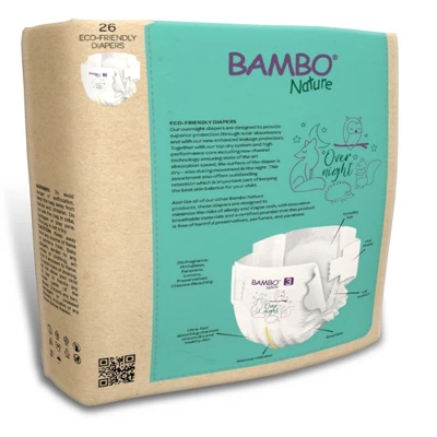 The Bambo® Nature Overnight Diapers are designed specifically for nighttime. The diapers unique Channel Technology makes it highly absorbent and able to soak up liquids quickly keeping your baby dry and comfortable for a better nights sleep. Bambo® Nature Overnight Diapers are eco-friendly and free of harmful chemicals making them gentle on sensitive skin. These size 3 diapers are suitable for children from 9 to 18 pounds. There are 26 diapers per pack and 4 packs per case.