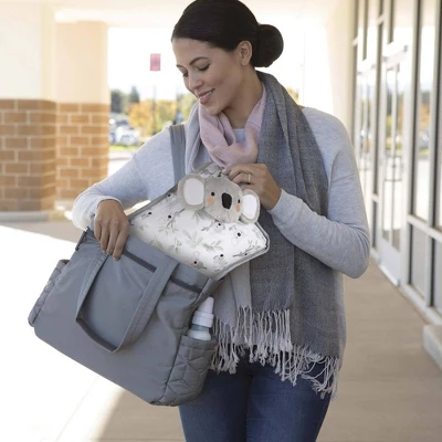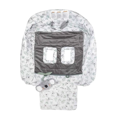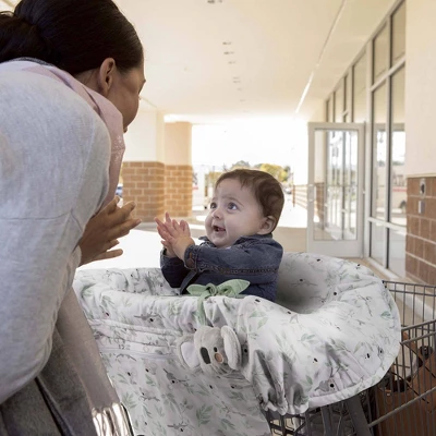 All-around coverage with a soft minky seat when shopping or dining out. Make outings with baby worry-free with the Boppy Preferred Shopping Cart and Highchair Cover. The easy-travel design packs into an integrated pouch so you can simply toss it in your car or diaper bag while on the go. Plush 360-degree coverage keeps baby comfy while adding a barrier between baby and those public use shopping carts and highchairs. Fully padded, any potential pinches or scratchy spots on the cart are covered. The seat of the Preferred Shopping Cart Cover is made of a super-soft minky material for added comfort. A SlideLine toy loop runs along the front of the cover to provide easy-to-reach entertainment for baby and keeps toys off the floor while shopping or dining out. This cover comes with a soft toy attached, and you can easily swap it out for a favorite toy or pacifier to keep baby occupied, giving you a few more moments for errands or lunch. The attached storage pocket faces front when in-use making it the perfect place for your phone and wallet while shopping. The shopping cart cover packs away small for storage. An elastic pocket inside the seat keeps baby’s bottle or sippy cup secure. The 2-point safety belt and elastic corners keep both baby and the cover in place. You can shop confidently knowing that the Boppy Preferred Shopping Cart and Highchair Cover passes all U.S. safety standards and fits most shopping carts and restaurant highchairs. The easy-wipe fabric keeps things clean between uses and is machine washable. Recommended age: 6 – 48 months