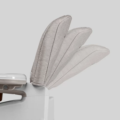 - Includes a 5-point padded harness, 3-position recline with one-hand adjustment and a machine-washable seat pad. The snap-on tray with lift off liner conveniently attaches to the rear legs for space-saving storage.