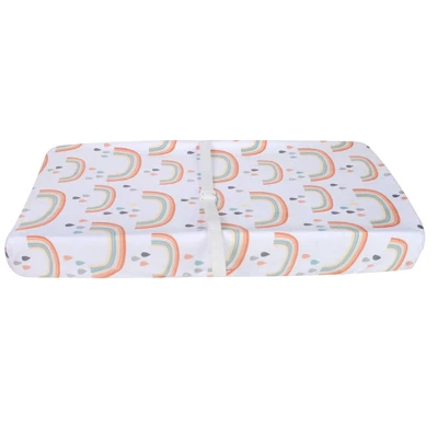 Rainbow print changing pad cover 16×32 inches with rubberized backing to keep leaks from getting through.