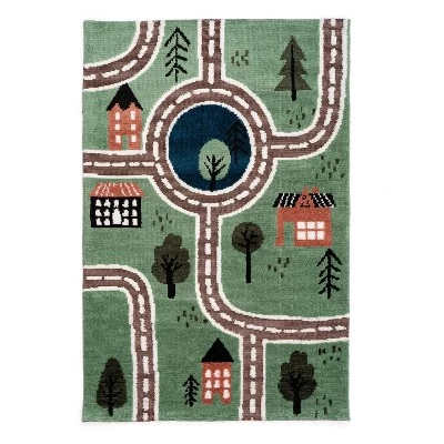Is it a soft rug, is it a gorgeous play mat, is it a fun interactive car and toy carpet? It is all of the above! These multifunctional, one of a kind play rugs from JumpOff Jo will kick up the fun in your kids’ room or family playroom. Plus it’s extremely soft for crawling babies, tactile for developing toddlers and ripe for imagination in big kids, too. This 3D carpet has recessed roadways for toy cars and other play characters. The design shows elements of a town and neighborhood, trees and houses. The green, tan, blue and brown colors are inspired by nature and their natural setting in an urban neighborhood. This playmat for babies and toddlers stimulates their senses and is soft underfoot. It’s size works as a nursery rug and it’s design can grow with your baby through different milestone developmental, and decor, stages. It’s a great kids rug for a playroom and is also it’s upscale and modern design looks nice in a living room or family room. It’s thick and durable to last through the years and handles kids’ activity and play. Educational, imaginative and colorful, its premium quality will protect floors while your little ones have tons of fun. Materials: Micro polyester pile, 100% polyester. Care: Spot wash with mild soap and water, line dry.
