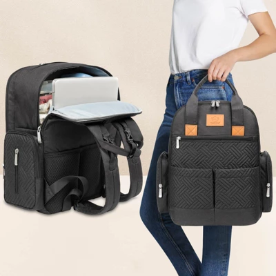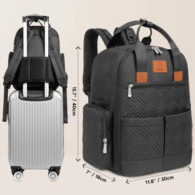 - Comes with diaper changing pad (25″L x 14″W), 15.6″ laptop pocket & external wet wipes pockets