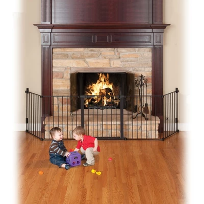 This one-of-a-kind gate system fits a standard 6’ hearth and most BBQ grills providing protection from the hot surfaces and flames of in-use fireplaces, accessing gas starter keys, sharp edges, hard corners and dirty logs. The door section can be placed anywhere in the layout giving you access where needed. Magnet lock technology draws door to the closed position and locks automatically. Each section is hinged with a rotating joint to allow for custom set up. Quick release hardware allows for easy removal when needed. The original 3 piece ConfigureGate will fit a 128” opening. With 2 included G4311 (24″) extensions will fit an 176″ opening. Optional extensions are available in 9” and 24” sections allowing for a custom fit. The system can be connected to use around wood burning stoves or to create a freestanding play area. (We recommend at least 2 additional sections for free standing play area).