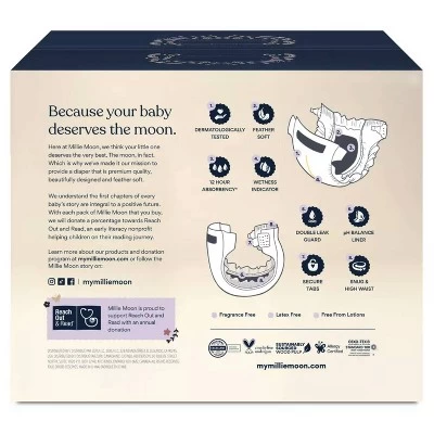Millie Moon has gone to the moon and back to design a luxury diaper that is high performing and beautifully crafted. Designed with performance in mind, the Millie Moon diaper has double leak guards, a snug & high waist and ultra absorbent core to help prevent blowouts and leaks. With up to 12 hours of absorbency* and our effective absorption technology Millie Moon Luxury Diapers trap and lock wetness away from your little one’s skin to keep them comfortable and dry. Millie Moon takes great care to develop a product that is gentle on your baby’s skin. Our diapers are made with carefully selected, feather soft materials and no chlorine, lotions, latex or fragrance. Certified by leading organisations including OEKO-Tex, Dermatest and Allgery Tested UK Millie Moon luxury diapers include a pH balanced layer and are gentle on delicate and sensitive skin. *Hours will vary depending on individual baby’s urine amount and bladder habits