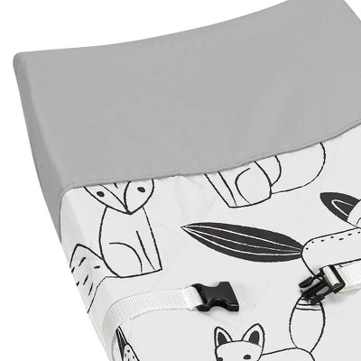 Black and White Fox Changing Pad Covers will help complete the look of your Sweet Jojo Designs nursery. It features a stylish black and white fox print with solid gray fabric. This changing pad cover can be used with standard or contoured changing pads and has elastic edges for a tailored, snug fit. This changing pad cover fits all changing pads up to 17in. x 32in.