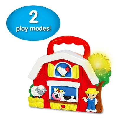 Babies and toddlers will welcome Old MacDonald’s Farm with open arms once they see and hear the delightful sounds and lights coming from the lightweight portable barn shaped toy with friendly faces. Little ones can select either mode – animal sounds like “moo” and “baa” and Old MacDonald’s Farm to sing along with. Large whimsical buttons, a bright red barn background, and a cheerful tree and sun that lights up make this a joyful classic! It has a large rounded handle for easy carrying, too. Measures 9” long x 7.5” high. Ages 12+ months. Requires two AA batteries (included).
